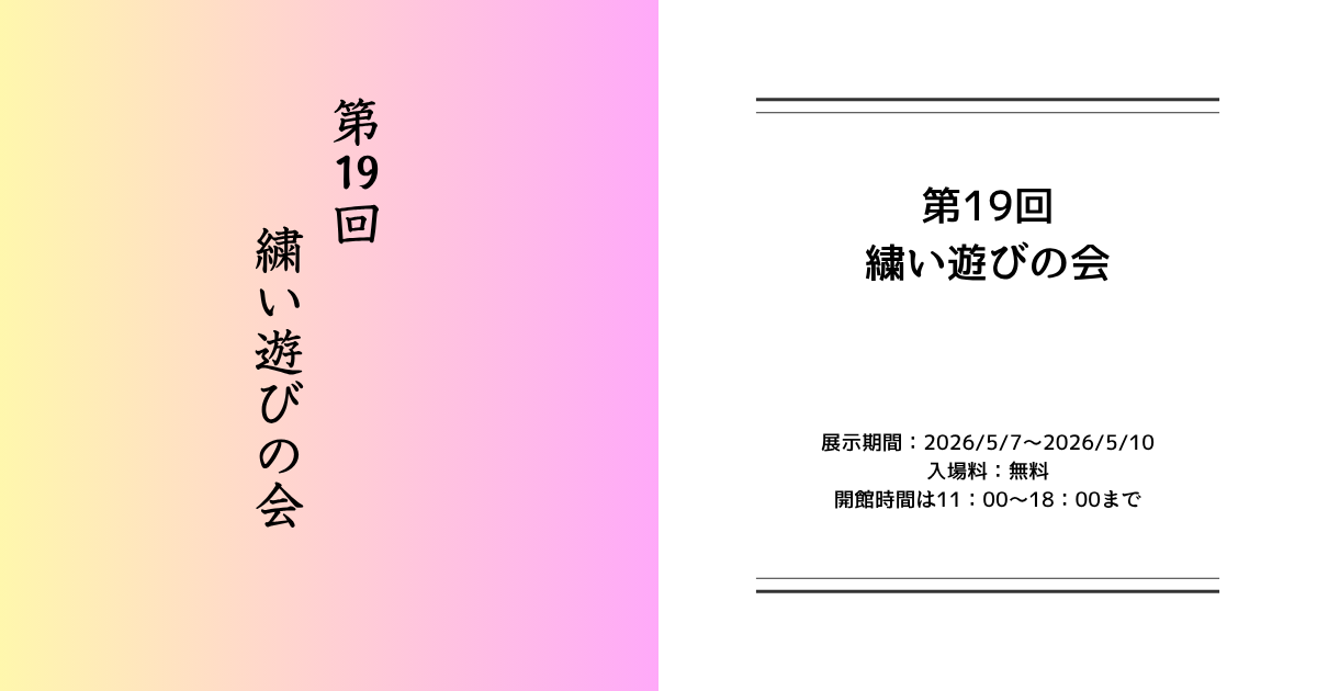 第19回 繡い遊びの会 2026 4/22 展示期間:2026/05/7~2026/05/10入場料:無料開館時間:11:00~18:00 本イベントについてのお問い合わせは以下までお願いします。 主催:ホームページ: 展示予定